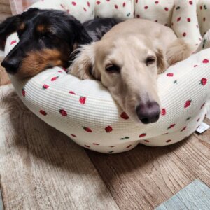 ごはんを食べ終わったあとのまったりタイム、ローラちゃんと仲良く一緒のベッドに入っているところを撮影しました📷