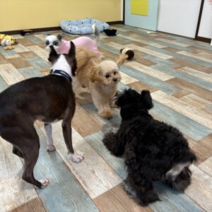 お泊りの日は2日間とも体験のワンちゃんが多かったので、お部屋で出会ったことが無いワンちゃんたちとの交流を楽しそうにしていました👍
