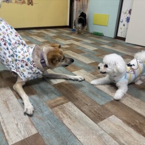 モコちゃんは他のワンちゃん達とおもちゃの取り合いっこをしたり、お部屋を走り回ったり🤗