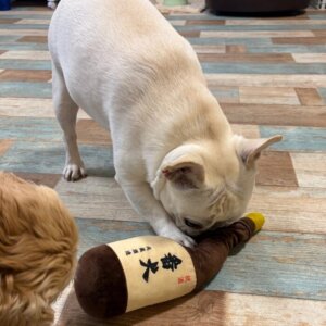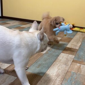 お部屋の中からお気に入りのおもちゃを出して、フレブルのもぐくんと張り切って遊んでいました笑