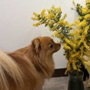 お散歩帰りにはお部屋の入り口にあるミモザをクンクンしながらお花の香りを楽しんでいましたよ👍