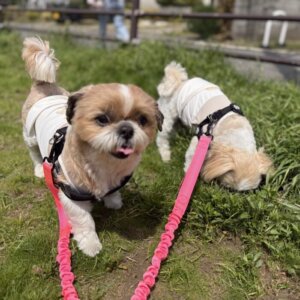 ふたり一緒にもも色のリードでスタスタと公園までお散歩に行きましたよ〜