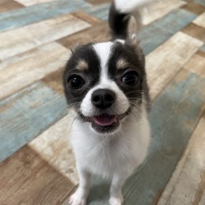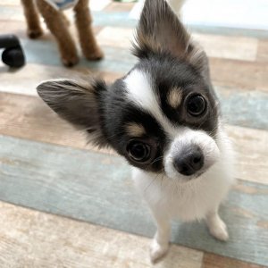 お耳をうしろに倒しながらスタッフにごあいさつに来てくれたのはチワワのベルくん?