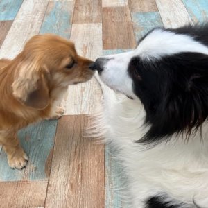 大きいワンちゃんにも変わらないペースで上手にごあいさつが出来るももじろうくん?